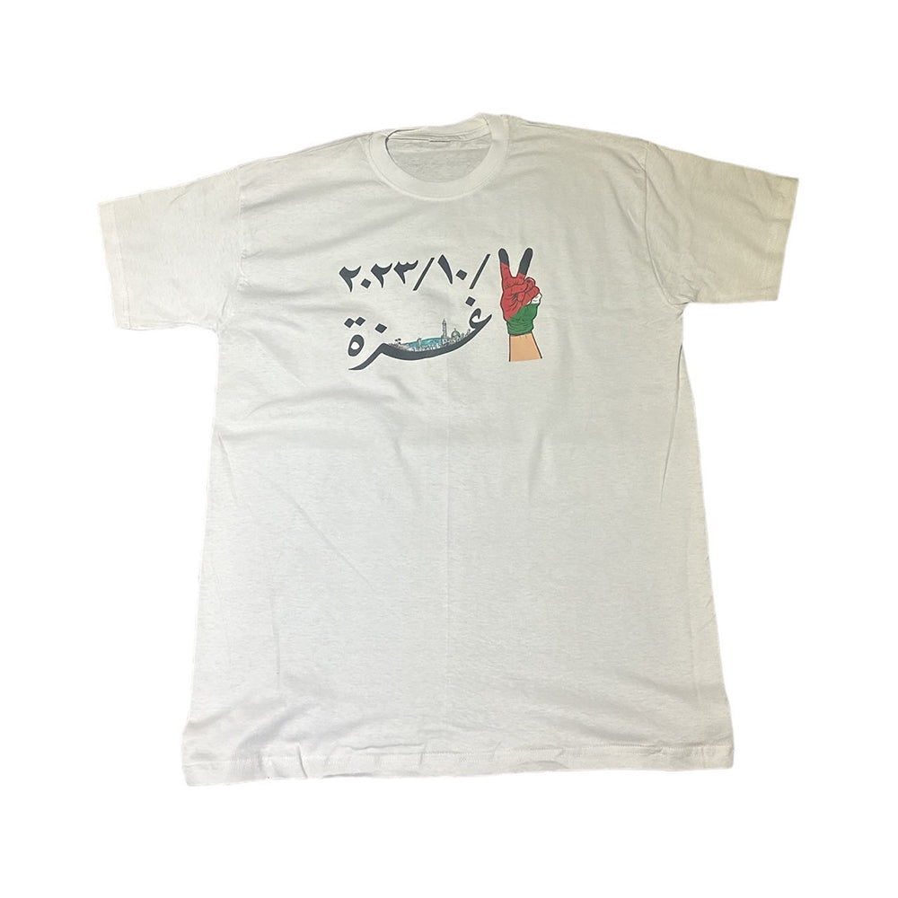 Adorning the front is the word "Gaza" in graceful Arabic script, a name that resonates with steadfastness and survival. Accompanying it is the date "10th 2023", also in Arabic, marking a moment in time that holds significance and remembrance. Central to this design is the iconic hand figure displaying a peace sign, imprinted with the vibrant colors of the Palestinian flag, symbolizing the enduring hope and unyielding spirit of the Palestinian people.