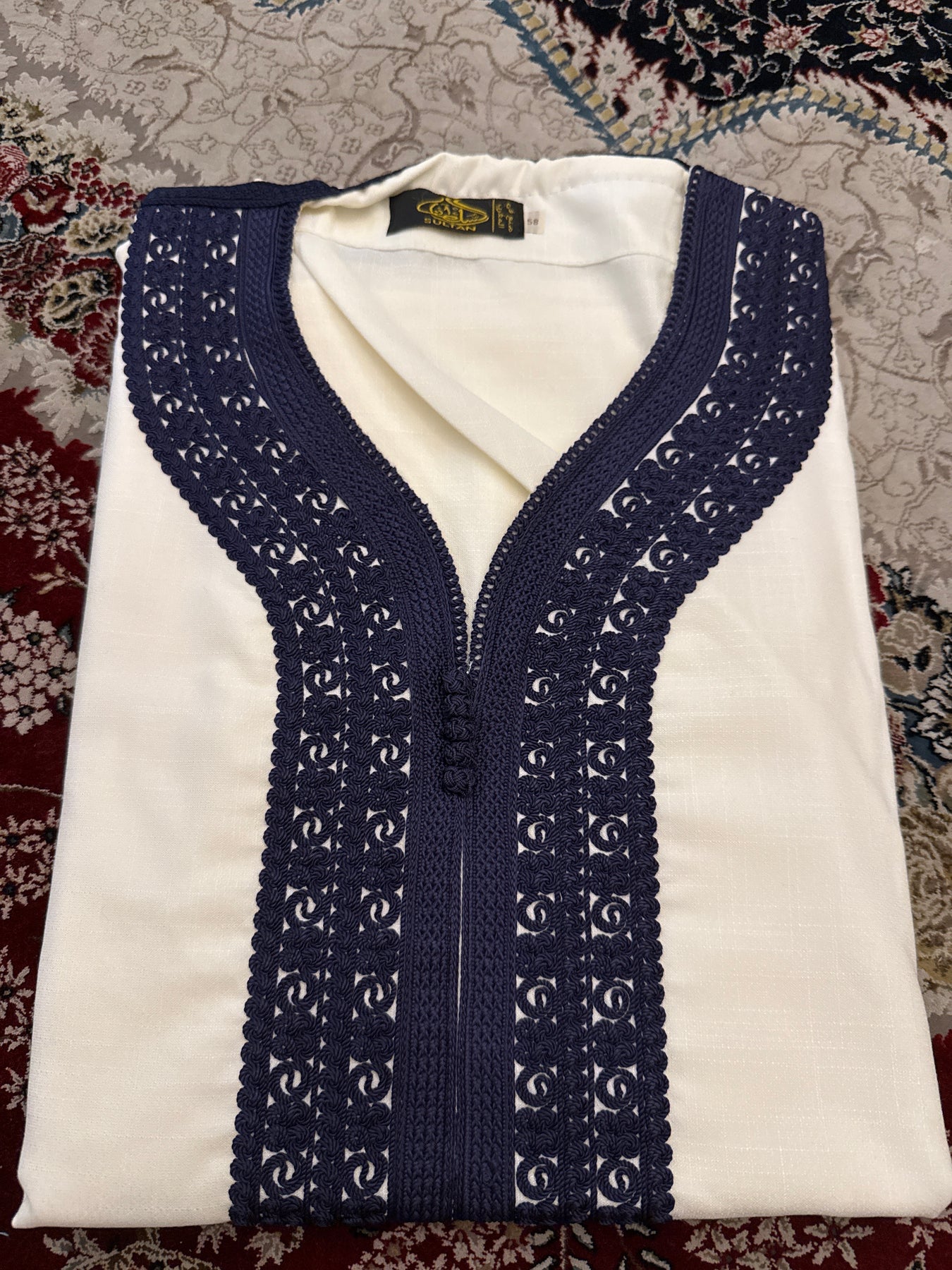 The Royal Atlas Edition features detailed Moroccan embroidery running vertically across the chest, inspired by classical North African design. The half-sleeve cut allows for breathable comfort while maintaining a structured and dignified silhouette.