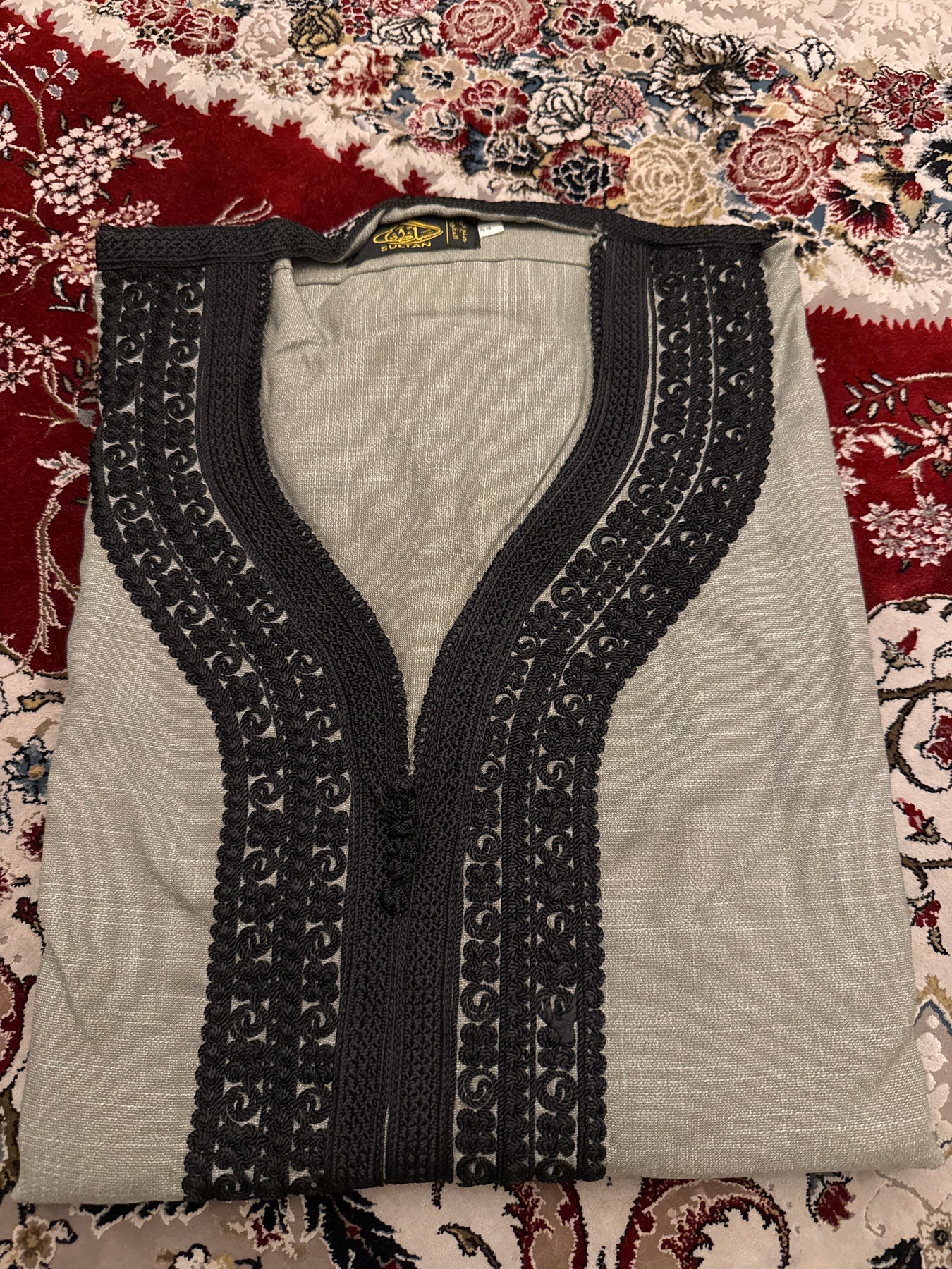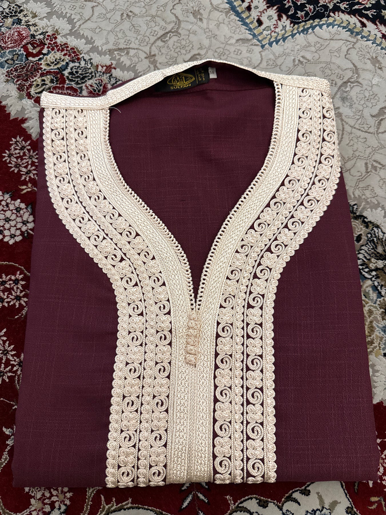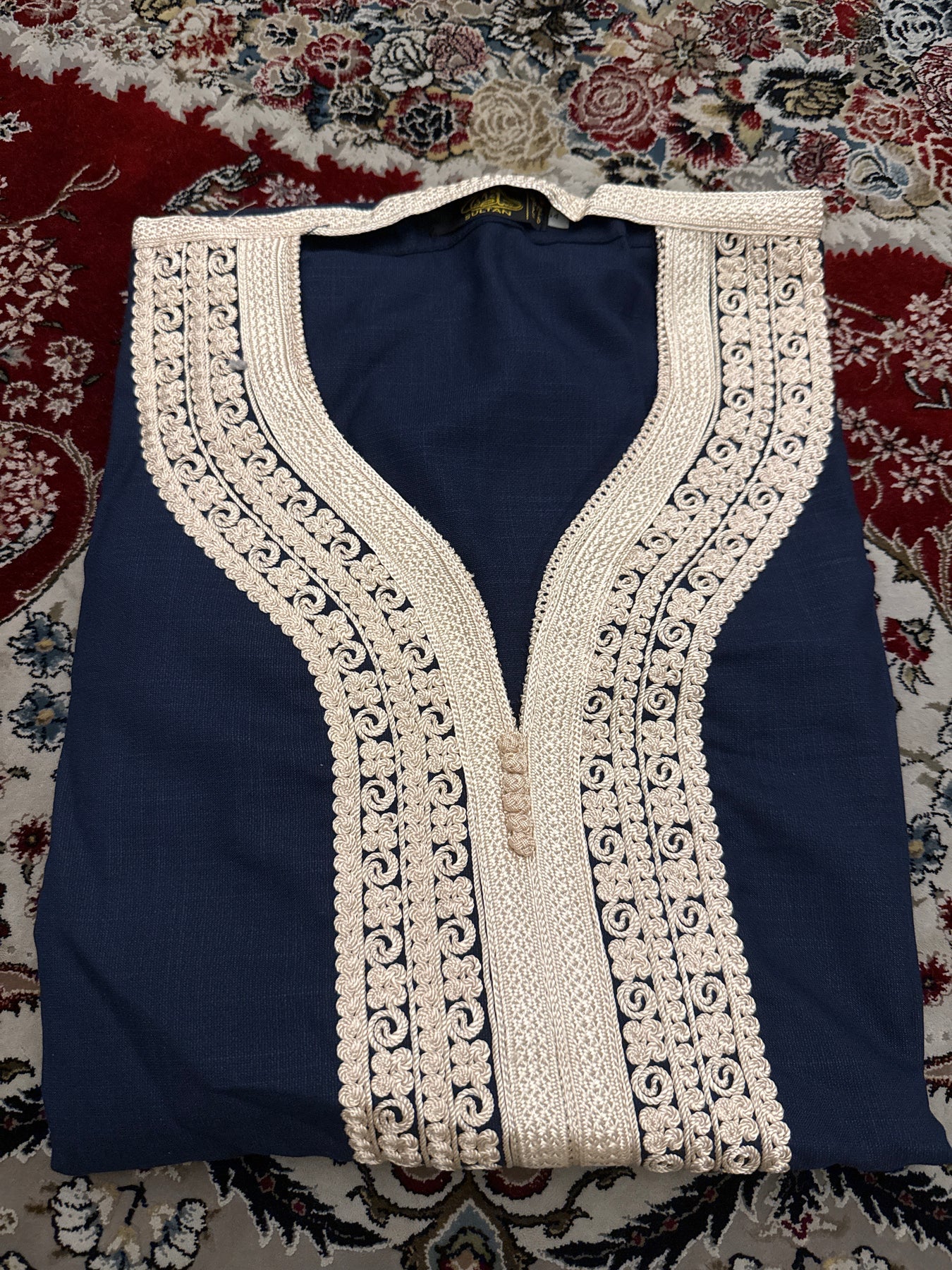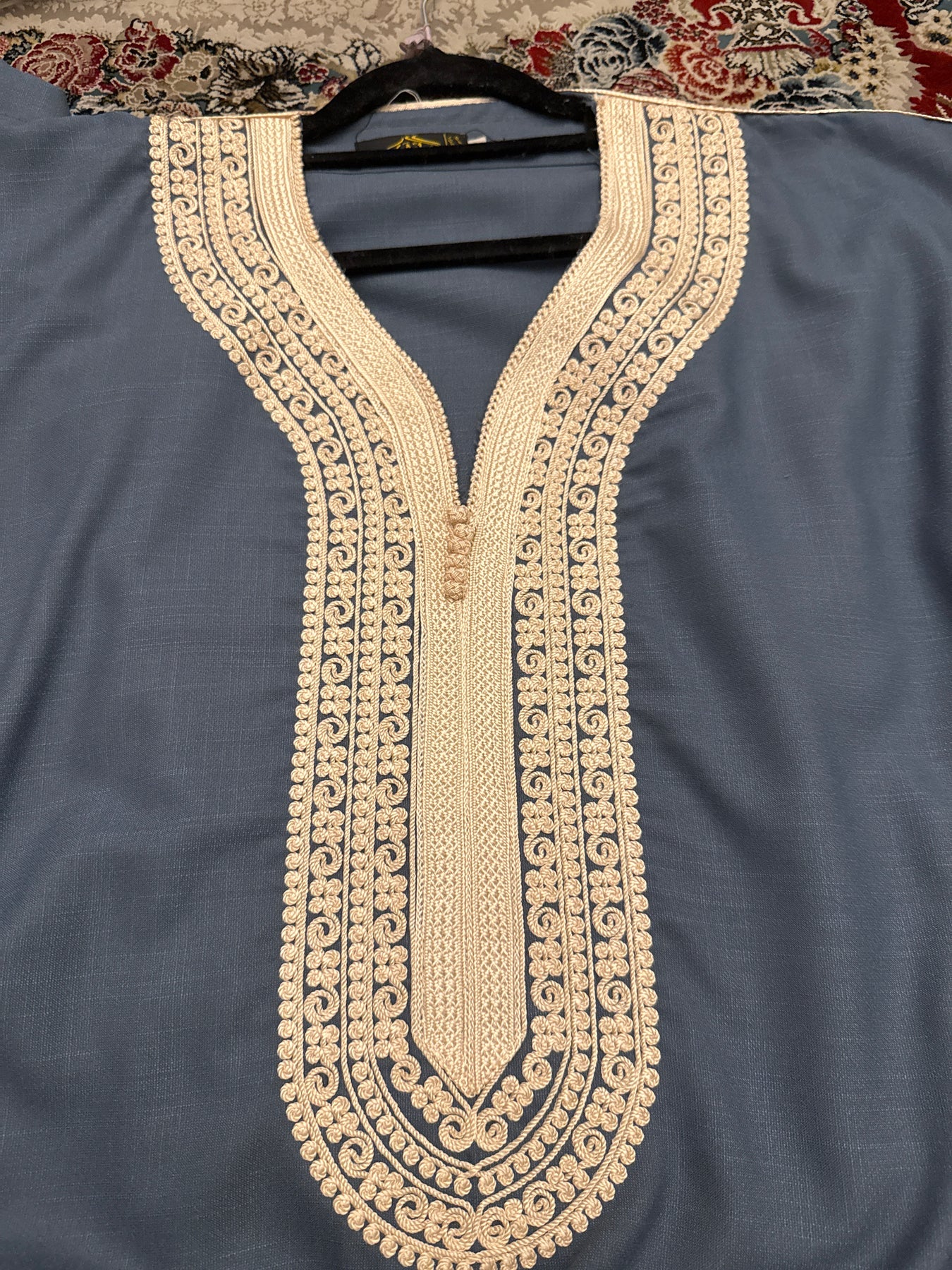 Intricately detailed chest embroidery inspired by traditional Moroccan craftsmanship.